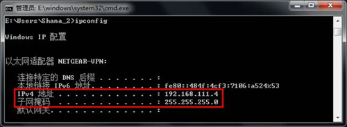 14、点击开始菜单>运行,或在桌面空白处点击鼠标左键然后按下组合键Win(Windows徽标键,一般位于Ctrl和Alt之间)+R,在弹出的窗口中输入CMD并回车即可打开命令提示符。输入“ipconfig”并回车执行,然后从结果中找到名为“NETGEAR-VPN”的网络适配器并查看信息: