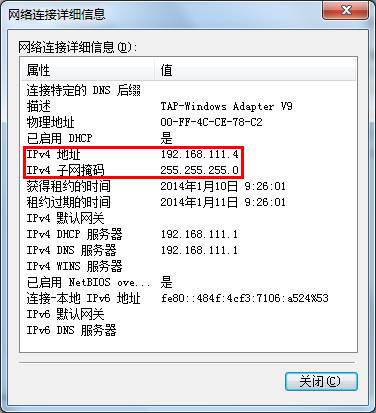 ③查看TAP-Windows Adapter V9网络适配器状态:与上文第五步类似,找到已经被重命名为“NETGEAR-VPN”的图标,点击鼠标右键选择状态,在弹出的窗口中点击“详细信息”(适用于Windows 8、7、Vista)或“支持”>“详细信息”(适用于Windows XP)。从下图中可以看到,我们已经获取到了与远端的NETGEAR R7000路由器同样网段的IP地址。